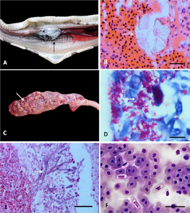 In the lungs, Mycobacterium sp. and Aspergillus sp. produced multifocal granulomatous pneumonias, with intralesional bacilli resistant to alcohol and septate hyphae, respectively, represented by nodular lesions, whitish and firm, 1 × 3 mm in diameter with caseous necrosis (Fig. 1 C-E).