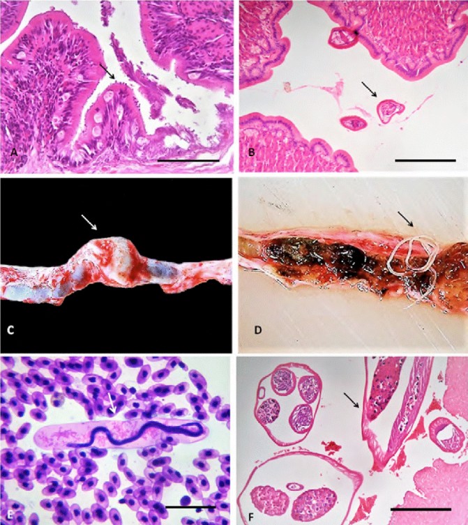The presence of 1 adult cestode (Crepidobothrium sp.) determined the increase of mucus on the intestinal surface, as well as the infiltration of heterophilic inflammatory cells on the mucosa and lamina propria, with hyperplasia of goblet cells, i.e., a moderate focal heterophilic catarrhal enteritis (Fig. 2B). The adults of M. oschei were found in the caudal renal vein of 1 snake, close to the kidneys, resulting in a 1.5 × 1 cm aneurysm with 35 parasites (Fig. 2C, D, respectively); its microfilariae (with a mild parasitemia of less than 200 individuals per cm3) were observed in peripheral blood surrounded by a broadly dilated sheath. These larvae were located in kidneys and lungs, which involved a discrete heterophilic inflammatory infiltration with focal interstitial nephritis and pneumonitis, respectively (Fig. 2E). Adults worms induced a thrombus with a focal heterophilic vasculitis (Fig. 2F).