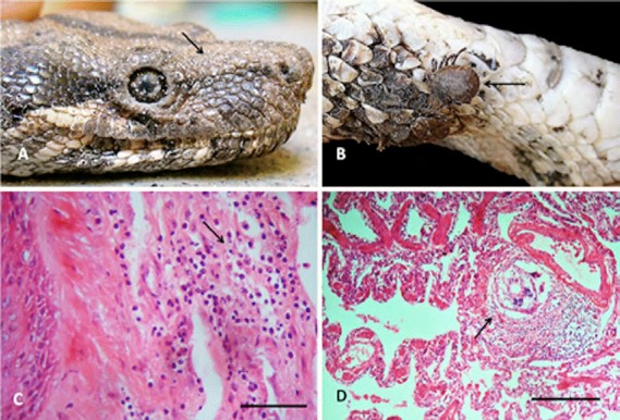 Parasite infections. Etiological agents of the parasitic infections were from 9 taxa belonging to 6 phyla: Actinobacteria (Mycobacterium sp.); Ascomycota (Aspergillus sp.); Apicomplexa (Hepatozoon sp. and Cryptosporidium sp.); Platyhelminthes (Crepidobothrium sp.); Nematoda (Macdonaldius oschei Chabaud et Frank, 1961), and Arthropoda: Ophionyssus natricis (Gervais, 1844), Amblyomma dissimile Koch, 1844 and Porocephalus sp.