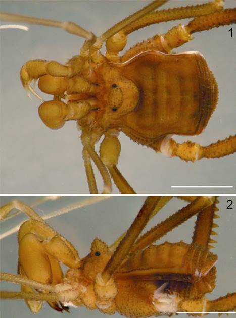 1’. Ocelos presentes y cuerpo de color marrón-rojizo (figs. 1, 2), oculario con una espina o tubérculo espiniforme apical (Cruz-López y Francke, 2017: fig. 20C; fig. 2), fémur IV con una hilera de tubérculos en posición ventro-retrolateral (figs. 21-24)……………………………………………………………………………2