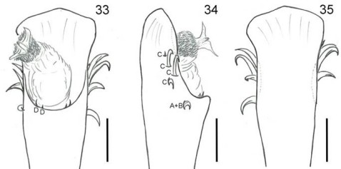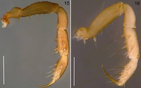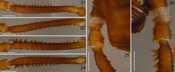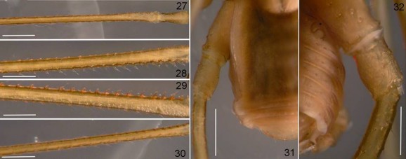 Descripción. Holotipo macho. Dorso: ancho máximo del scutum 3.5 mm; largo del scutum 4.9 mm. Scutum dorsal tipo zeta, protuberancia media ligeramente redondeada. Coda suavemente pronunciada. Oculario muy cerca del margen anterior del prosoma, con forma cónica y cubierto con tubérculos espiniformes dispersos, con un tubérculo espiniforme. Áreas mesotergales bien definidas, áreas I-III de similar tamaño, área IV ligeramente más ancha que las demás; surco I curveado, surcos III-IV rectos. Áreas I-V y terguitos libres con una hilera transversal de tubérculos espiniformes (figs. 1, 2). Vientre: coxa I con una hilera de tubérculos setíferos espiniformes muy largos, coxa II con una hilera similar y tubérculos más pequeños, coxa III con una hilera de tubérculos de forma cónica en los márgenes anteriores y posteriores, coxa IV cubierta de tubérculos cónicos dispersos y algunas sedas; espiráculos visibles (fig. 5). Quelíceros: basiquelicerito largo, bulla poco marcada y abarcando gran parte de la longitud del basiquelicerito; mano queliceral ensanchada; dedo móvil con un diente pequeño proximal al DQ, dedo fijo con una hilera de pequeños dientes de tamaño homogéneo y continuos (figs. 7, 9, 11). Pedipalpos: trocánter con un TSE ventro-apical, fémur subrectangular (fig. 15), superficie dorsal ligeramente convexa; ventralmente con una hilera de 7 tubérculos espiniformes, siendo los proximales más largos. Patela cilíndrica, sin armadura. TSE de la tibia en ambos márgenes de la siguiente manera: IIi, (2 > 1 > 3), bases de los TSE 2 y 3 del lado mesal fusionadas, base del TSE 1 muy próxima a las otras bases fusionadas. Tarso con 4 TSE en ambos márgenes de la siguiente manera: iIIi, (3 = 2 > 1 > 4). Uña más corta que el tarso (figs. 15, 17). Patas: Medidas de las patas en la Tabla 1. Todas las patas son largas, cubiertas con tubérculos espiniformes pequeños desde el trocánter hasta el metatarso. Trocánter I-II en forma cilíndrica, trocánter III globular. Trocánter IV con numerosos tubérculos espiniformes, específicamente en los márgenes distales de la región dorsal y ventral. Fémur I-III largos y delgados, fémur IV ligeramente ensanchado, con 3 hileras longitudinales de tubérculos espiniformes largos, la hilera ventro-retrolateral con los tubérculos más prominentes y decrecientes en tamaño desde la base hacía el extremo apical (figs. 21-26). Patela I-IV cilíndrica, con pequeñas granulaciones dispersas. Tibia I-IV recta, con hileras de pequeños tubérculos. Metatarso I-IV recto con algunas sedas dispersas. Conteo tarsal: 5(2):15(3):7:7. Genitales masculinos: pars distalis aplanada dorsoventralmente, margen apical de la LV redondeado. Follis más largo que ancho, con una proyección bilobular en la parte dorso-apical. Arreglo de las MS de la siguiente manera: 4 pares de MS C en 2 hileras longitudinales, una en cada lateral y localizadas en la parte media de la LV, en cada hilera la MS C más apical de menor tamaño y en forma recta, las 2 siguientes de tamaño medio y en forma curvada, la más basal de tamaño menor que las 2 anteriores y en forma curvada; un par de MS A+B latero-basal al follis; 2 pares de MS D de tamaño muy reducido, la media de menor tamaño, ubicadas en la base del follis (figs. 33-35).
