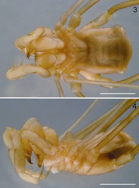 Descripción. Holotipo macho. Dorso: ancho máximo del scutum 2.5 mm; largo del scutum 3 mm. Scutum dorsal tipo zeta, protuberancia media poco pronunciada, coda suavemente pronunciada. Oculario en el margen anterior del prosoma, redondeado apicalmente. Mesotergo con 5 áreas lisas, sin ornamentación; áreas I-III de tamaño similar, área IV ligeramente más grande que las demás. Terguitos libres con una hilera transversal de tubérculos setíferos muy pequeños (figs. 3, 4). Vientre: coxa I con una hilera de TSE cónicos muy largos, coxa II-III con una hilera similar de TSE más pequeños, coxa IV cubierta de tubérculos cónicos, dispersos y con algunas sedas. Espiráculos traqueales visibles (fig. 6). Quelíceros: basiquelicerito largo, “bulla” suavemente marcada, ocupando casi toda la longitud del basiquelicerito; mano queliceral ensanchada; dedo móvil con el DQ prominente, obtuso, con 4 dientes distales muy pequeños y contiguos al DQ; dedo fijo con hilera de al menos 7 dientes contiguos, los distales ligeramente más grandes (figs. 8, 10, 12). Pedipalpos: trocánter con un tubérculo setífero espiniforme en la parte ventrodistal. Fémur subrectangular, superficie dorsal ligeramente convexa; ventralmente con una hilera de 5 TSE, el basal notoriamente más largo que los demás. Patela cilíndrica, sin armadura. Tibia con 4 TSE en ambos márgenes de la siguiente manera: IiIi (1 = 3 > 2 = 4). Tarso con 3 TSE en ambos márgenes de la siguiente manera: IIIi (1 = 2 > 3 > 4). Uña de similar tamaño que el tarso (figs. 16, 18). Patas: Medidas de las patas en la Tabla 2. Todas las patas son largas y delgadas, cubiertas con algunas sedas. Trocánter I-II en forma cilíndrica, trocánter III globular. Trocánter IV desarmado, sin apófisis. Fémur I-III largo y delgado, fémur IV no ensanchado, solo con 2 hileras ventrales de tubérculos espiniformes, presentes solo en la parte apical. Patelas I-IV cilíndricas. Tibias I-IV recta. Metatarsos I-IV recto con algunas sedas dispersas (figs. 27-32). Conteo tarsal: 11(3):23(3):7:7. Genitales masculinos: pars distalis aplanada dorsoventralmente, margen apical de la LV redondeado, bifurcado con un surco que comienza desde el centro del margen apical y se extiende hasta la mitad del largo de la LV. Follis más largo que ancho, con una proyección bilobular en la parte dorsal. Arreglo de las MS de la siguiente manera: 5 pares de MS C espatulares muy largas y curvadas, todas se originan cerca de la base de la lámina ventral; 2 pares de MS D, ambas cortas, pero el par ventral de tamaño menor, MS A+B ausentes (figs. 36-38).