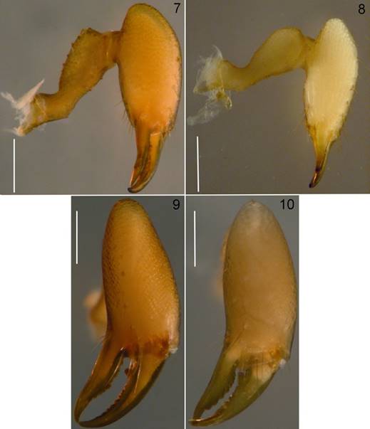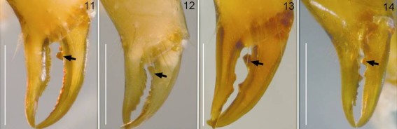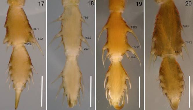 2’. Dedo móvil del quelícero sin un diente pequeño proximal al DQ (figs. 12-14), base del TSE 1 separada de las bases de los TSE 2 y TSE 3 (figs. 18-20)……………………………………………………………………….3