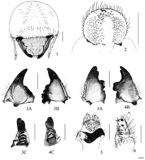 1. Cranium con 9-10 sedas dorsoepicraneales y 8 sedas anterofrontales; epifaringe con helis cortos dispuestos en 2 filas irregulares transversales; acroparia con 6-7 sedas espiniformes gruesas. Sur y noreste de México. . . . . . . . . . . . . . . . . . . . . . . . . . . . . . . . . . . . . . . . . . . . . . .P. virescens Burmeister