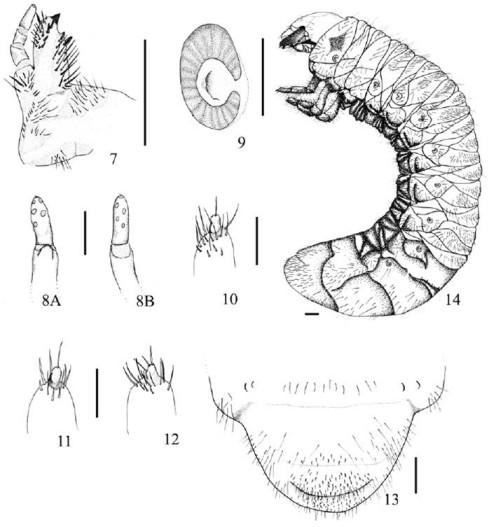 Cabeza (Fig. 1): hipognata. Ancho de cápsula cefálica: 5.51-5.60 mm. Superficie del cranium pardo amarillenta, sedas predominantemente de color castaño. Con una fila de 9 sedas cercana de la sutura epicraneal. Frente con 3 sedas frontales exteriores, 9 posteriores a cada lado, 8 anteriores frontales, 2 en ángulo anterior, 4 en base antenal a cada lado. Stemmata ausente. Clípeo trapezoidal con 2 sedas anterocentrales, 2 laterales a cada lado. Labro simétrico, con márgenes redondeados, con 9 sedas en parte posterior y 6 sedas postlaterales a cada lado; margen anterior del labro con 2 sedas. Epifaringe (Fig. 2) de 1.70 mm de ancho y 1.11 mm de longitud, con zigum y 6 sencilias delante al zigum; 15 helis que se encuentran en 3 filas de forma irregular, epizigum, acroparia, plegmatium y proplegmatia ausentes. Dexiophoba y laephoba definidos. Dexiotorma casi recta ligeramente recurvado, con el extremo medio adelgazado. Laeotorma corta y ancha. Pterotorma estrecha, sin cono sensorial. Crepis no definido y estrecho. Acanthoparia con 12-14 sedas gruesas y agudas. Chaetoparia derecha con 65 sedas gruesas y 6 sedas delgadas. Chaetoparia izquierda con 55 sedas gruesas y 28 sedas delgadas. Mandíbula derecha 1.81 mm de ancho, 2.72 mm de longitud, con lámina cortante distal separadas por dientecillo incisivo proximal (S1 + S2 fusionados), separados de S3 por muesca. Superficie ventral (Fig. 3A) con un área estriduladora y 15 estrías; proceso ventral bien desarrollado. Vista dorsal (Fig. 3B). Scrobe con 7 sedas, región dorsal molar con 8 sedas y brustia con 6 sedas. Calx largo y prominente. Área molar con 2 lóbulos M1-2 (Fig. 3C). Mandíbula izquierda de 1.61 mm ancho, 2.62 mm longitud. Superficie Ventral (Fig. 4A) con área estridulatoria presente y 19 estrías, proceso ventral largo y redondeado, brustia con 14 sedas, lóbulo molar bien desarrollado (Fig. 4C). Vista dorsal (Fig. 4B) área sensorial con 2 dientes apicales separados por muesca, scrobis con 7 sedas, acia bien desarrollada, superficie dorso molar con 5 sedas. Esclereoma hipofaríngeo (Fig. 5) asimétrico, con 4 sedas en lado derecho y 17 sedas largas y delgadas en lado izquierdo. Labio con 27 sedas largas y delgadas, y 15 sedas gruesas y cortas. Maxila (Fig. 6). Galea con uncus apical, 4 unci y dos filas con 4 helis; lacinia con uncus apical. Palpo maxilar con 4 segmentos, segmentos 1 y 2 desiguales en longitud, segmento 4 más largo que el 3. Área estriduladora con 9 dientes pequeños y agudos (Fig. 7). Antena formada por 4 segmentos, con 8 áreas sensoriales; 4 dorsal (Fig. 8A) y 4 ventral (Fig. 8B).