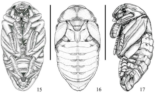 Pupa (Figs. 15-17). Longitud corporal 15.3 mm, ancho 7.3 mm. Cuerpo de forma alargado ovalado. Color blanco amarillento. Vestidura finamente aterciopelada. Superficie de cabeza glabra, fuertemente inclinada hacia abajo. Frente con depresiones irregulares, clípeo convexo; piezas bucales claramente diferenciadas; ojos compuestos ligeramente visibles; tecae antenal claramente visibles y engrosados. Pronoto convexo. Meso y metanoto bien diferenciado. Pteroteca cerca del cuerpo, ventralmente curvado, extendiéndose hacia el segundo segmento abdominal. Protibias de igual tamaño respecto a los tarsos. Mesotibias ligeramente más cortas que mesotarsos. Metatibias ligeramente más largas que metatarsos. Abdomen. I segmento delgado en comparación que los segmentos II-V los cuales son claramente más anchos, con órganos dioneiformes bien definidos entre segmentos III-VII. Espiráculo I elongado con peritrema fino y cubierto ligeramente por teca alar. Espiráculos II-IV con peritrema fino no prominente, espiráculos de segmentos V-VII cerrados. Espiráculo VIII se proyecta con sentido mesial. Noveno segmento abdominal triangular, lateralmente extendido hacia lado ventral, sin urogomphi. Último esternito abdominal con ámpula genital ligeramente pronunciada en el macho.