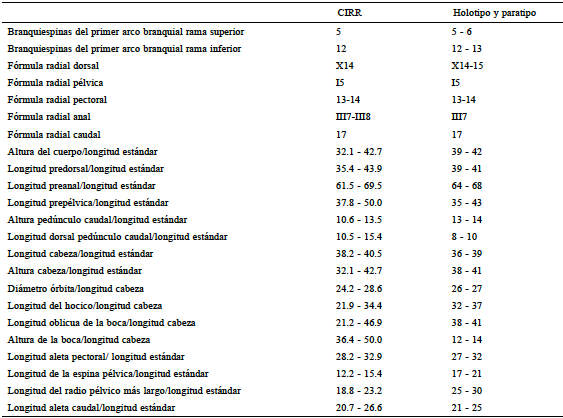 En los registros fotográficos de H. ecosur en el golfo de México (Gallardo-Torres et al., 2014; Zarco-Perelló et al., 2014) no se incluyen los detalles señalados por Bello et al. (2014) como parte de las buenas prácticas necesarias para verificar el estatus taxonómico de los organismos y sustentar la ampliación del ámbito geográfico de esta especie. En la tabla 1 se presentan las características merísticas y morfométricas de H. ecosur (n = 9) obtenidas de los ejemplares depositados en la Colección Ictiológica Regional de Referencia UMDI-Sisal (CIRR). Los valores coinciden con los reportados por Victor (2012) para el holotipo y el paratipo de H. ecosur.
