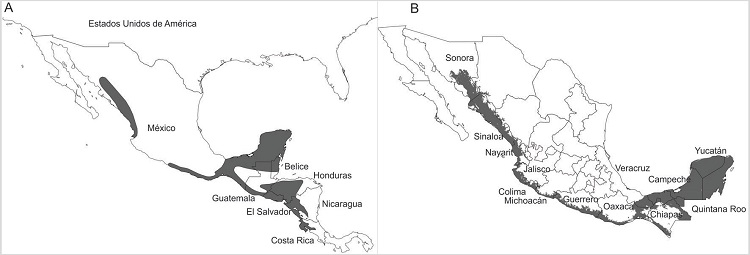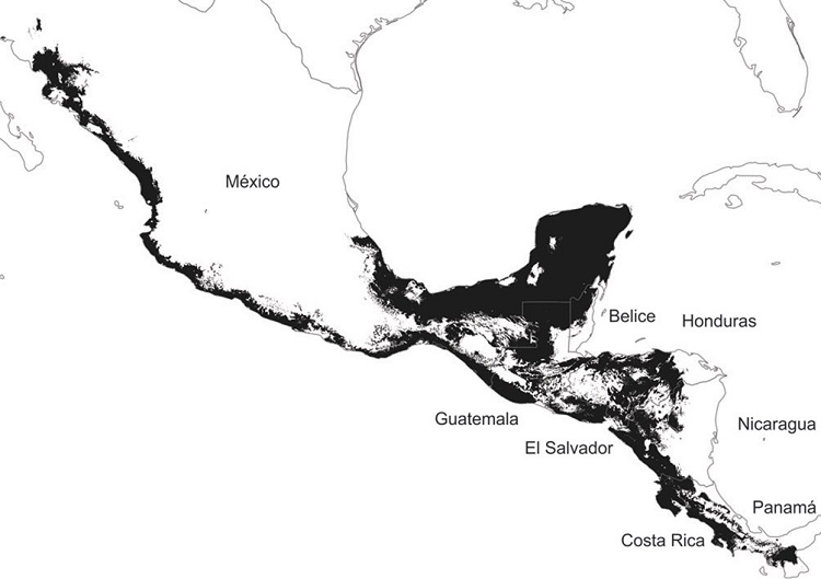 Para la calibración de los MDE, se requiere definir "a priori" el área de accesibilidad o "M" (sensuSoberón y Peterson, 2005), la cual se delimitó considerando un buffer a partir de los registros pero con base en las provincias biogeográficas definidas por Löwenberg-Neto (2014) y Morrone (2014); es decir, se incluyeron aquellas provincias tanto con registros de presencia, como aquellas que estuviesen cercanas y contiguas a una distancia aproximada de 200 km, ya que potencialmente la especie podría tener acceso dada su capacidad de dispersión. Éstas incluyeron para el occidente, a la provincia de las Tierras Bajas del Pacífico y la Sierra Madre Occidental, para el oriente, a la Provincia Veracruzana y Sierra Madre Oriental, y al Eje Volcánico Transversal y el Balsas en México, hasta la provincia de Gautuso-Salamanca, en Panamá.