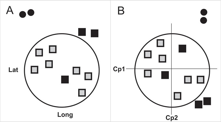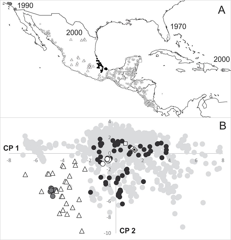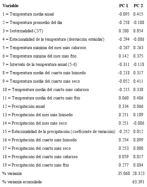 Uno de los criterios para evaluar si los registros novedosos (aquellos más allá de su distribución conocida) son ambientalmente importantes, es analizar si corresponden también con ambientes novedosos (fig. 2B) (Sánchez-González, 2013). Por eso se llevó a cabo una descripción del perfil bioclimático a partir de los registros totales compilados de la especie, en combinación con 19 variables bioclimáticas (tabla 1) obtenidas del proyecto Worldclim a una resolución espacial de 30 segundos (≈ 1 km2) (Hanna et al., 2016; Hijmans et al., 2005). Con ayuda del SIG (Arcview 3.3; ESRI, 1999) se extrajeron los valores de cada una de las variables climáticas correspondientes con cada registro de la especie y mediante un análisis de componentes principales (ACP) realizado en PAST (Hammer et al., 2001), se analizaron e identificaron a aquellos registros ambientalmente novedosos, con base en la distancia en el espacio ambiental que guardaron con relación a los registros históricamente conocidos (fig. 4).