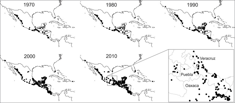 Para llevar a cabo la compilación de los registros, se realizó una búsqueda exhaustiva de los registros históricos del loro frente blanca en literatura (Calvo y Blake, 1998; Chávez-León, 2007; De Labra et al., 2010; González-García, 2006; González-García et al., 2014; Jordano, 1983; Kantak, 1979; Monroy-Ojeda e Isern, 2013; Plasencia-Vázquez y Escalona-Segura, 2012; Robertson y Woolfenden, 1992; Ruelas-Inzunza y Aguilar-Rodríguez, 2010). Además, se revisaron bases de datos disponibles en línea, como la Infraestructura Global de Información sobre Biodiversidad (GBIF, 2017, por sus siglas en inglés), la Comisión Nacional para el Conocimiento y Uso de la Biodiversidad (Conabio, 2016) y el Laboratorio de Ornitología de la Universidad de Cornell (EBIRD, 2016). La búsqueda de los registros en las bases de datos se realizaron directamente con el nombre científico de la especie, Amazona albifrons, y se descargó toda la información tal cual se obtuvo. La curación y edición de la base incluyó la eliminación de los registros que no contaban con coordenadas, localidad y fecha, y sólo se dejaron registros únicos por fecha y localidad, eliminando todos aquellos dudosos. Posteriormente, se realizó una reconstrucción histórica del conocimiento de su distribución geográfica por décadas, a partir de la descripción de la especie hasta la actualidad; es decir, los registros se identificaron y se representaron de manera acumulativa, en mapas que abarcaron unidades temporales de 10 años (fig. 3).