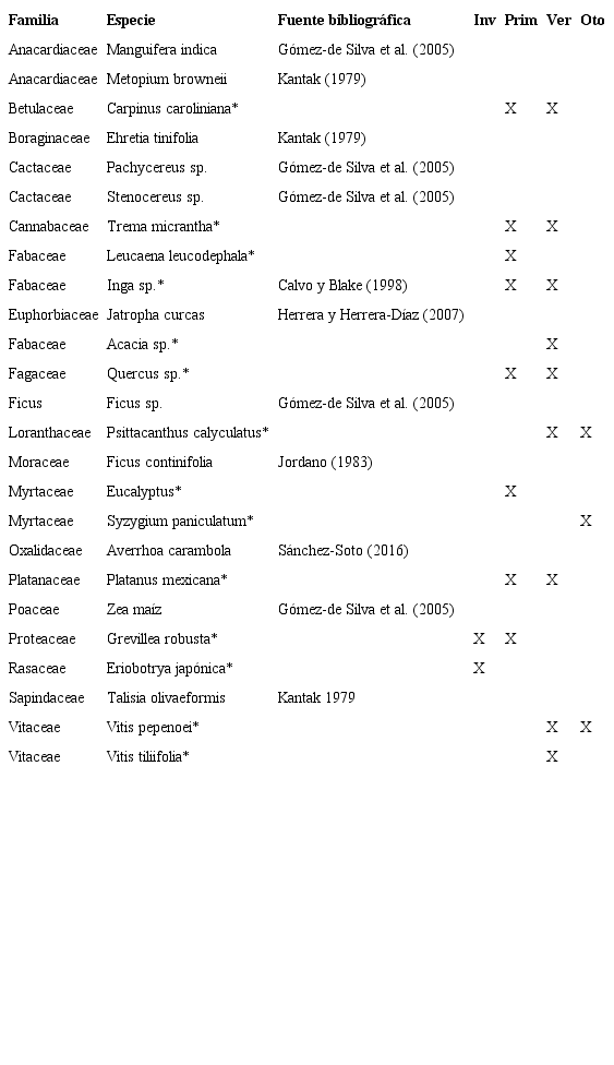 Esta cantidad de registros y su elevada abundancia relativa a lo largo de todo el año, nos permitió demostrar que es una especie residente que sugiere una reciente colonización en la región. Esta condición se vio reforzada por la frecuente observación, durante el invierno y la primavera, de conductas reproductivas en las parejas registradas. Por otro lado, se registró un total de 14 especies de plantas que son consumidas por el loro frente blanca en diferentes épocas del año en el centro de Veracruz (tabla 2), que, contrastando con la lista de especies consumidas en otras regiones, resulta en el registro de una ingesta de 13 nuevas especies de plantas; es decir, 93% distinta de la dieta previamente conocida.
