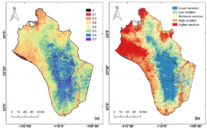 The Cape Region is characterised by the composition of its vegetation; it is located in an arid region with the tropical dry forest on the foothill of mountains and pine forest and oak-pine forest on the highlands (Fig.1). The results of this study showed that the highest NDVI values were located on highlands where radiation is intercepted by the canopy of evergreen oaks and pines of the woodland (León-de la Luz & Breceda, 2006); this result was consistent with that of the Moderate Resolution Imaging Spectrometer (MODIS) based-study carried out in Baja California Sur (Salinas-Zavala et al., 2017); the results of CV were also consistent where the variation on the Cape Region was less than 20% and within the reserve less than 10% in both studies (Salinas-Zavala et al., 2017).