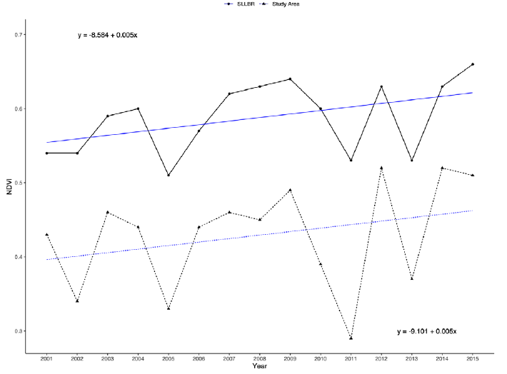 This study described NDVI trends using the slope obtained from simple linear regression, using NDVI as a response variable and time (years) as predictor variable; two-tailed p-values were used to test the significance of these trends.