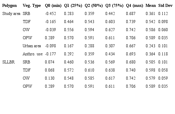 The spatial distribution of average NDVI for the growing season from 2001 to 2015 is shown in Fig. 2a where it gradually increased from the coast to highlands. The transition zone between TDF and woodlands had the highest NDVI values while the SRB had the lowest ones. This figure also highlighted that cities and surrounding areas had the lowest NDVI value. Table 1 shows the descriptive statistics of NDVI values by vegetation type for the study area and the SLLBR where SRB had the highest variability and the minimum values (-0.452); the highest NDVI values were observed in OW with a maximum of 0.742. The NDVI values in the SLLBR exhibited a similar pattern; however, the observed values in this area were higher.