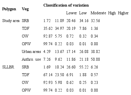 Figure 2b shows the spatial distribution of coefficient of variation (CV) of NDVI for the study period (2001-2015). As shown in this figure, CV values in the reserve were lower than in the remainder of the study area; this low variability extended to areas where TDF expands. Higher CV values were recorded along rivers (usually dry along the year), close to the main cities in the northern and western most regions of the study area. The CV was categorised into 5 types (Table 2) according to quintiles and coded as follows: lower variation (< = 0.14), low variation (0.14 < CVNDVI < = 0.20), moderate variation (0.20 < CVNDVI < = 0.25), high variation (0.25 < CVNDVI < = 0.32) and higher variation (CVNDVI > 0.32). As shown in Table 2, in the study area most of the SRB have high and higher variability, 34.1 and 32.5%, respectively. For the TDF, the classification suggested that this vegetation type had low and lower variability, 35.6 and 34.9%, respectively. Both OW and OPW had the lowest variability compared with the other vegetation types in the study area. Within the SLLBR polygon, values showed a similar pattern but with higher percentages for lower, low and moderate CV categories.