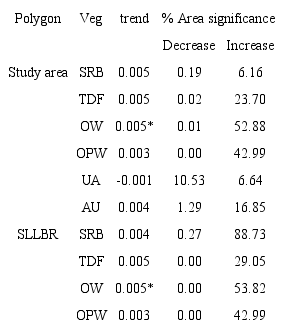 Trend values of NDVI by vegetation type are shown in Table 3. OW and OPW are the vegetation types that have increased in at least 40% of the study area. Although increasing patterns of SRB and TDF were lower than in other vegetation types, significant and positive values were greater than the significant and negative values.