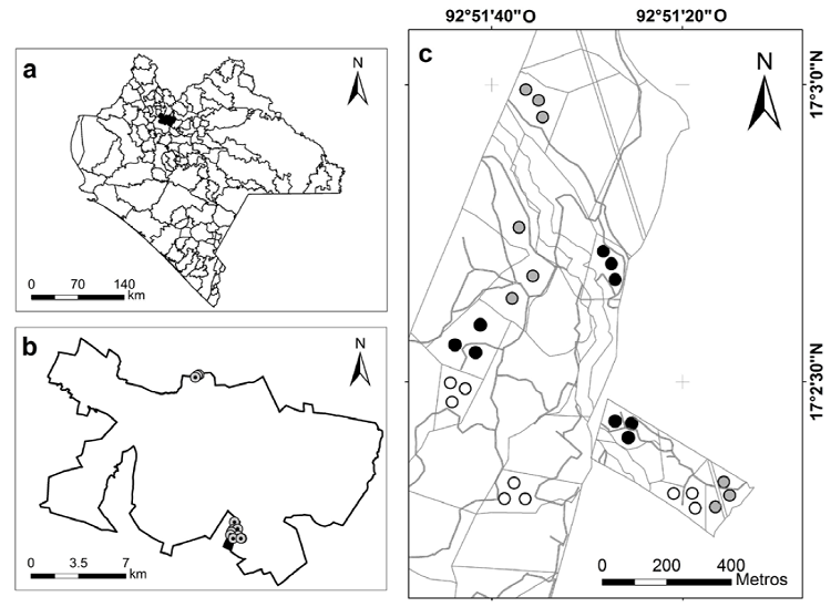 El trabajo se desarrolló en el municipio de Jitotol, Chiapas, México (Fig. 1a). La superficie total del área para el bosque bajo manejo forestal mediante el MDS es de 163 ha, que incluye los predios forestales “San Martín” y “Santa Anita”, ubicados al sur del municipio (17°01’45” - 17°03’10” N, 92°52’10” - 92°51’12” O), con una altitud promedio de 1,700 m, encontrándose bajo este sistema de aprovechamiento desde 1996. El área representativa de un bosque sin manejo (SM) se encuentra dentro del centro ecoturístico “El Siempre Verde”, ubicado a 10-12 km en línea recta dirección norte desde los predios bajo manejo forestal, entre las coordenadas 17°08’42” y 17°08’52” N, 92°53’27” y 92°53’00” O, con una superficie de 24 ha y una altitud promedio de 1,780 m; estos bosques no han estado bajo algún sistema de manejo desde hace más de 40 años, aunque ha habido extracción esporádica de algunos individuos para la elaboración de inmuebles (Ing. José Rafael Ramos Moreno, com. pers.). Las condiciones climáticas y edáficas entre las áreas norte y sur del municipio son relativamente similares y en el pasado mantuvieron bosques similares en su estructura y composición (Breedlove, 1981; Ramírez-Marcial et al., 2001).