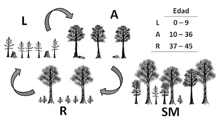 Los tratamientos del MDS aplicado en el área de estudio se definen a partir de turnos de alrededor de 40-45 años, con 5 tratamientos silvícolas aplicados cada 8 años (Fig. 2), según información obtenida del plan de manejo elaborado para los predios antes mencionados. Los rodales en diferentes etapas de aplicación del método definidos como liberación (L), aclareos (A) y regeneración (R) fueron considerados, bajo una perspectiva de cronosecuencia sucesional, como etapas de desarrollo que se pueden observar a través del tiempo a lo largo del ciclo de intervenciones (González-Espinosa et al., 2006; Pastur et al., 2002; Walker et al., 2010).