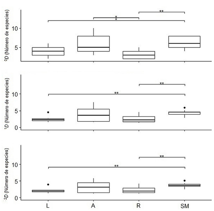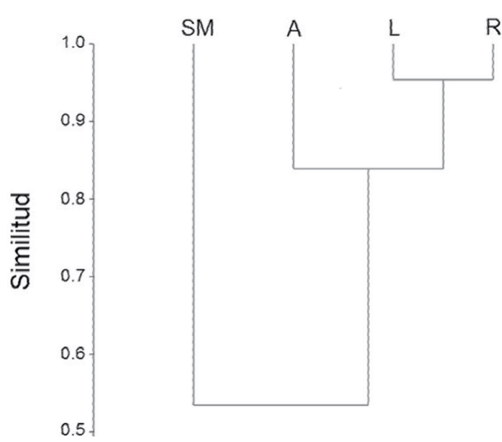Los valores de diversidad fueron diferentes entre las distintas condiciones del bosque para 0D (F3,32 = 6.75, p < 0.001), 1D (F3,17.3 = 8.33, p < 0.001) y 2D (F3,17.3 = 7.96, p < 0.002). La prueba post hoc de Tukey solamente mostró mayor riqueza de especies (0D) en A respecto a la etapa R entre tratamientos silvícolas dentro del bosque con manejo; el bosque sin manejo (SM) mostró valores más altos respecto de la primera (L) y última etapas (R) del ciclo de tratamientos silvícolas bajo el MDS en cuanto a 0D (prueba de Tukey), así como con 1D y 2D (prueba de Games-Howell) (Fig. 4). La similitud medida por el índice de Morisita-Horn presentó un valor de 0.92. La similitud fue alta en los tratamientos silvícolas del bosque manejado bajo el MDS, al comparar las comunidades arbóreas entre L y R (0.95), así como al comparar la etapa A con L (0.87) y R (0.80). El bosque sin manejo (SM) se segregó del bosque manejado al presentar valores bajos de similitud respecto de los distintos tratamientos silvícolas del bosque manejado; L (0.43), A (0.66) y R (0.49) (Fig. 5).