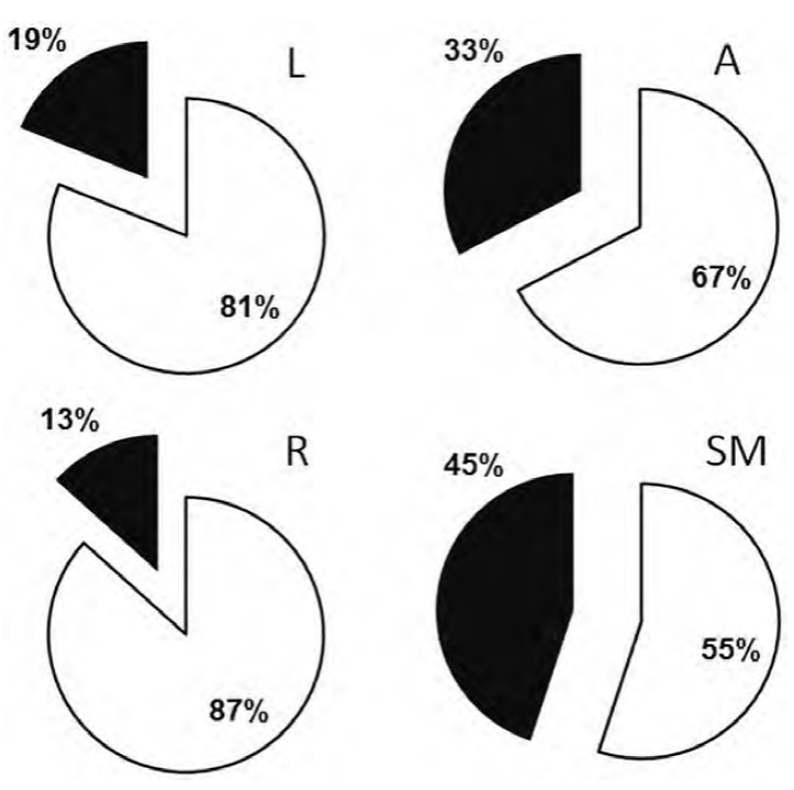El VIR mostró diferencias entre las distintas condiciones del bosque para las variables VIR-P (F3,32 = 9.76, p < 0.0001) y VIR-L (F3,32 = 9.86, p < 0.0001). La prueba post hoc de Tukey entre tratamientos silvícolas dentro del MDS indicó un incremento en el VIR-P de 67% observado en A, a 87% observado en R (p < 0.05), y una reducción de los valores de VIR-L de un 33% a un 13% (p < 0.05) en el mismo sentido; el SM mostró valores más bajos para VIR-P y mayores para VIR-L respecto de las etapas L (p < 0.001) y R (p < 0.0001) dentro del ciclo de tratamientos silvícolas bajo el MDS (Fig. 6).