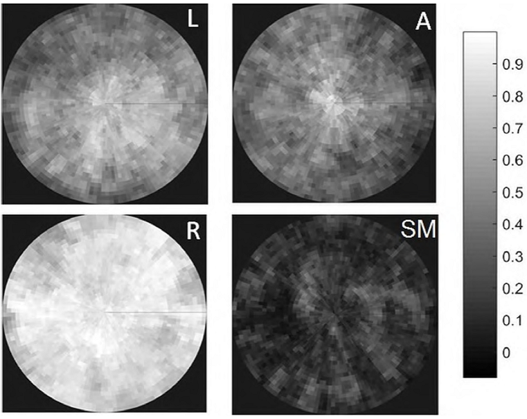 La cobertura del dosel mostró diferencias entre las distintas condiciones del bosque (F3,32 = 23.72, p < 0.0001). La prueba de Tukey no mostró diferencias entre las distintas etapas dentro del ciclo de tratamientos silvícolas bajo el MDS; de manera general, SM presentó valores más altos de cobertura del dosel respecto de las diferentes etapas del bosque manejado bajo el MDS (L, A y R) (p < 0.0001). Esta relación se observó claramente en imágenes promedio de la fracción de apertura del dosel (Fig. 7).