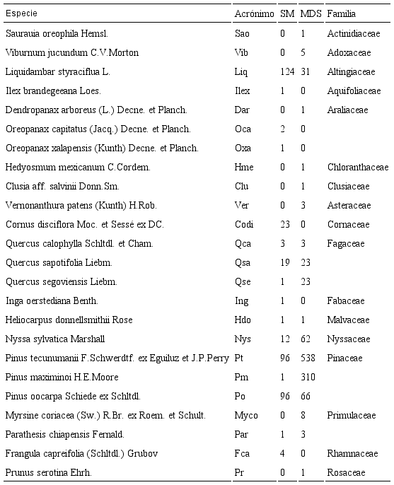 Se registró un total de 24 especies de árboles pertenecientes a 16 familias (Tabla 1). Las especies con mayor abundancia fueron Pinus spp., Quercus spp., Liquidambar styraciflua y Nyssa sylvatica. Del total de especies registradas, 8 estuvieron representadas por un único individuo y 16 por menos de 10 individuos; más de 50% del total de especies fueron poco frecuentes (Fig. 3).