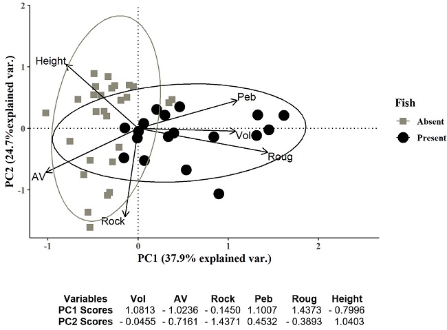 Rock pool structural variables and habitat complexity were used to assess the occurrence, abundance, species richness, and length distribution of rock pool fishes with principal components analysis (PCA) performed in the R package Vegan (Oksanen et al., 2016). Rock pool width, depth, length, perimeter, volume, height, roughness, relationship of the surface area-volume ratio and perimeter-volume ratio, and habitat structure (rocks, sand, pebbles, and algae) were included in the PCA. All environmental variables were tested for normality, and transformations (log, log10, square root, 1/x, arcsine) were applied to fulfil normality assumptions where necessary. Then, the variables were standardized (z-scores) (Borcard et al., 2011). To select the number of interpretable axes in the PCA the Broken Stick Model was computed, which randomly divides a stick of one-unit length into the same number of components as there are PCA axes. The components are arranged in decreasing order and compared to the eigenvalues of each component of the PCA analysis. The PCA components whose eigenvalues were larger than the length of the corresponding piece of the Broken Stick Model were interpreted. A step-wise process was conducted to aid in the exclusion of highly collinear explanatory variables, using Cook’s distance and Variance Inflation Factor (VIF), (Oksanen et al., 2016).