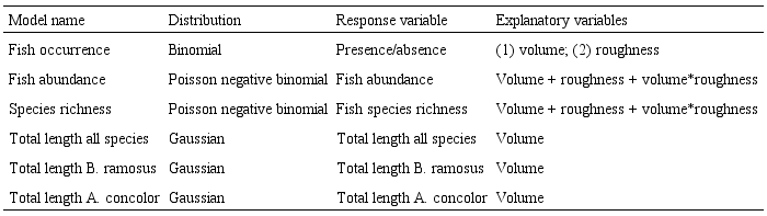 Volume, roughness, height, rock, pebbles, and A/V had VIF values below 3.5 and were used as explanatory variables in generalized linear models (GLMs). Presence or absence of fish was set as the response variable under a binomial distribution (Table 1). In this model rock pool volume and roughness were highly correlated, but with no evidence that changes in roughness are determined by changes in volume, we constructed individual models for each variable (Table 1). Either fish abundance or species richness were set as response variables and tested using values from 42 rock pools. These explanatory variables were standardized and scaled (mean and SD) to aid in comparisons and model contributions. For both response variables a Poisson Negative Binomial distribution was used to account for the high frequency of absences (zeros) in the rock pools. Fish total length, recorded for all species in 15 rock pools, was used as the response variable in a linear model with volume, roughness, height, rock, pebbles, and A/V as explanatory variables and a Gaussian distribution. The same process was applied independently for each of the 2 most abundant species (Table 1). Model selection was based on the Akaike information criteria (AIC) applying the dredge function of the MuMIn package in R (Oksanen et al., 2016), and models were validated with graphical tools, goodness of fit, and over dispersion tests in R (Oksanen et al., 2016; Zuur et al., 2009). Final models for each dependent variable had a maximum of 2 explanatory variables and their interactions (Table 1).