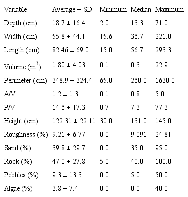 Fish occurred in only 18 (40%) of the 45 sampled rock pools. The first 2 components of the PCA explained 62.6% of the variation and rock pools tended to aggregate in 3 groups (Fig. 2). The first group included rock pools with volumes below 0.56 m3, surface roughness ranging from 0 to 9%, and a wide range of A/V ranging from 0.38 to 5 (Fig. 2, top left panel). These rock pools were located over 1 m height in the intertidal zone and the substrata had low rock cover (< 40%) and pebbles (< 35) but had high cover of sand. Rock pools in the second group had similar characteristics to the first group with volumes below 0.33 m3, surface roughness ranging from 0 to 11%, and A/V values ranging from 0.38 to 5 (Fig. 2, bottom left panel). These rock pools were distributed from 0.9-1.35 m height in the intertidal zone and mainly differed from those in the first group because of the high values of rock cover (> 55%) and low values of pebbles (< 5%). The third group was characterized by rock pools with larger dimensions (width, length, surface area, perimeter, and mainly depth) and consequently, volume that ranged from 0.32 m3 to 22.09 m3, surface roughness ranging from 4-24%, and A/V ranging from 0.14 to 2.14 (Fig. 2, top and bottom right panels). These rock pools were located in a wide range of intertidal heights from 0.3 to 1.42 m height, cover of rock varied from 25-75% and pebbles constituted between 0-50% of the substratum. Fish did not occur in the first and second group but were present in the third group of rock pools.