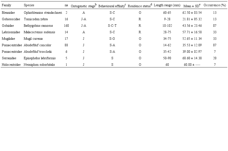 Fish with sizes lower than the minimum length recorded for juveniles or with anatomical or morphological traits typical of larvae (lack of colour, or pigmentation of larvae, spines or rays typical of fishes in larval stages) were labelled as such. We considered this method an adequate indication of fish life history stages as it was successful in numerous previous studies of rock pool fishes (Ghanbarifardi & Malek, 2009; González-Murcia et al., 2016; Grossman, 1982).