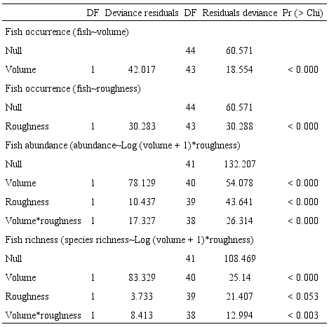 Fish occurrence was determined by rock pool volume and roughness (Table 4). Fishes only occurred in rock pools with volumes larger than 0.29 m3 and roughness higher than 4.7% (Fig. 3). The model for fish occurrence with volume as the explanatory variable accounted for 69% of the variance in fish occurrence, while the model including surface roughness explained 49% of the variance. We found that the odds ratio of fish presence to fish absence changed by a factor 6.58 for every one-unit increase in volume, and by a factor 0.42 for a one-unit increase in surface roughness. The probability of fish occurrence changed from absence (0) to presence (1), at a volume of 0.59m3 and at 10.85% roughness (Fig. 3).