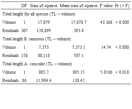 Rock pool volume and roughness and the interaction of these terms had significant impacts on fish abundance and species richness (Table 4). Abundance increased 16.5 times with an increment of one-unit of volume (1 m3) and 1.14 times with an increment of one-unit roughness. However, the contribution of surface roughness to abundance was reduced when volume increased. For species richness, an increment of one-unit of volume (1 m3) in rock pools increased fish richness by 1.65; similarly, a change of one-unit of surface roughness in rock pools increased fish abundance 0.7 times. Nonetheless, the interaction of both terms indicates that the influence of surface roughness on species richness decreased when volume increased. Total length of all fishes (R2 = 0.1209), and the most abundant species B. ramosus (R2 = 0.0784), and A. concolor (R2 = 0.05246) were related to rock pool volume (Fig. 4, Table 5). However, rock pool volume explained only low levels of variance and small fish did also occur in larger pools.