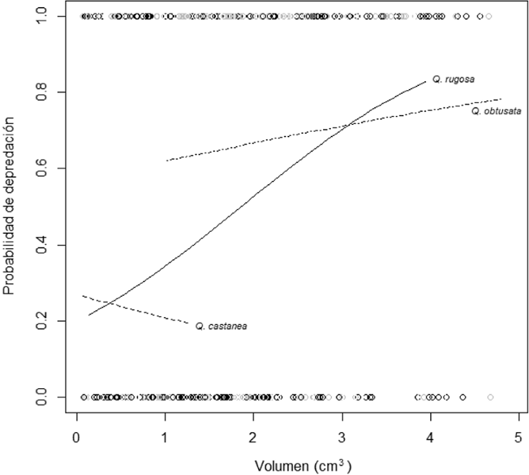 Los niveles de depredación registrados guardan relación con el volumen promedio de las bellotas, que en el caso de Q. obtusata fue de 2.6 cm3 (± e.e. 0.9, n = 275); en Q. rugosa fue de 1.15 cm3 (± 0.7, n = 389) y el más pequeño se registró en Q. castanea (0.43 cm3 ± 0.3, n = 297). Las diferencias en el volumen de las bellotas de las 3 especies fueron significativas (F2, 958 = 747.2, p < 0.001).