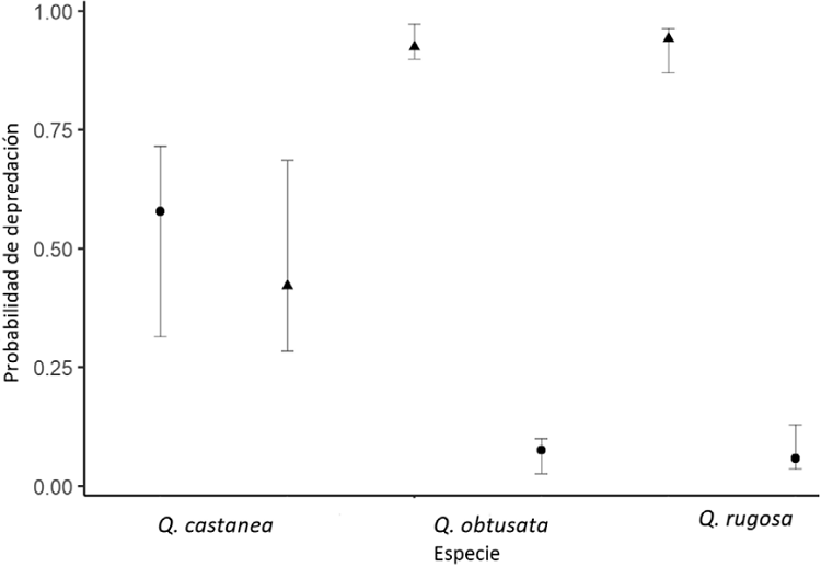 Para evaluar si existen diferencias significativas en el tamaño (volumen) de las bellotas entre las 3 especies de encino, se realizó un Andeva de una vía y se obtuvieron intervalos de confianza de 95%. Por otra parte, para analizar el efecto del tamaño de las bellotas y la especie de Quercus en la depredación predispersión total (i.e., la realizada por larvas de curculiónidos y de palomillas), se usaron modelos lineales generalizados de efectos mixtos (GLMM) con distribución binomial, usando el software R (R Core Team, 2018). Se probaron 2 modelos: uno con interacción entre las variables y uno aditivo (i.e., sin interacción). Éstos se compararon utilizando pruebas de razón de verosimilitud, observando si al eliminar la interacción se generaban diferencias significativas entre ellos. En ambos se usaron como variables explicativas la especie de encino (Q. rugosa, Q. obtusata y Q. castanea) y el volumen de cada bellota, y se incluyó como factor aleatorio el árbol (individuo). La variable de respuesta fue la condición de la bellota, con 2 categorías (sana o depredada). En el análisis se usaron los datos de todas las bellotas, excluyendo solamente a las depredadas por ambos tipos de organismos (curculiónidos y palomillas en la misma bellota). Estas bellotas se excluyeron de éste y todos los análisis subsecuentes debido a que representaban un porcentaje muy bajo (3%) de la muestra total (e incluso < 1% en Q. castanea), y su inclusión dificultaba el análisis.