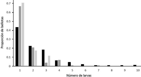 En cuanto a la superinfestación, los niveles más altos se registraron en Q. obtusata, en la que 56.6% de las bellotas depredadas por curculiónidos (considerando solo aquéllas en que se pudo observar y contabilizar directamente a las larvas) tuvo más de 1 larva. En Q. rugosa, la superinfestación se presentó en 33% de las bellotas depredadas por curculiónidos, y en Q. castanea en 29.4%. En la primera especie, además de registrarse la menor proporción de bellotas con 1 sola larva, se encontraron hasta 10 larvas en una misma bellota (fig. 3), mientras que en Q. rugosa se registró un máximo de 7, con una alta proporción de bellotas con 1 o 2 larvas. Por su parte, en Q. castanea, el máximo fue de 3 larvas por bellota, y registró la proporción más alta de bellotas con 1 sola larva (fig. 3). Ésto muestra que hay mayor superinfestación y un mayor número de larvas por bellota en la especie con las bellotas más grandes, y que este fenómeno es más raro y limitado en la especie con bellotas más pequeñas. Al interior de cada especie de encino no hubo diferencias significativas en el volumen de las bellotas con 1 sola larva y las que presentaban 2 o más (Q. rugosa t = 1.24, g. l. = 81, p = 0.21; Q. castanea U12,5 = 27, p = 0.79; Q. obtusata t = -1.77, g. l. = 136, p = 0.07).