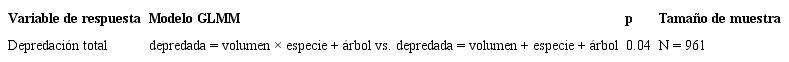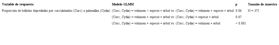 Para evaluar si existen diferencias en la proporción de bellotas depredadas, ya sea por larvas de curculiónidos o de palomillas, se elaboraron 4 modelos GLMM con distribución binomial: uno aditivo, uno con interacción entre variables y 2 con una sola variable explicativa, la especie de Quercus o el volumen de las bellotas. La variable de respuesta fue la proporción de bellotas depredadas, con 2 categorías (depredadas por curculiónidos o por palomillas). Al igual que en los modelos anteriores, se usaron como variables explicativas la especie de encino y el volumen de la bellota, y como factor aleatorio el árbol. En este análisis se usó la muestra de bellotas depredadas (i.e., se excluyó a las sanas). Una vez seleccionado el modelo, se hizo la trasformación logarítmica de los estimadores, para obtener valores entre 0 y 1, con la fórmula: