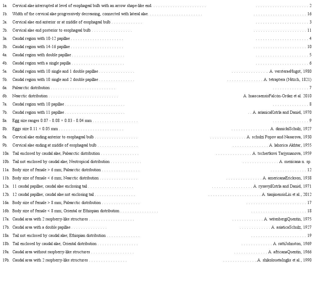 Behnke et al. (2015) analyzed the molecular phylogeny and morphology of 5 species of Aspiculuris parasites of voles and house mice. They concluded that the use of DNA is the most informative way to distinguish between species which are very similar to one another since number and configuration of caudal papillae are not reliable. We partially agree with this statement since only 5 of the 20 species of the genus have been studied from a molecular perspective (Behnke et al., 2015; Goswami et al., 2015). In addition, the identification of Aspiculuris is not based exclusively on the number and arrangement of the caudal papillae, but on a combination of morphological characters additional to these, such as the terminal region of the cervical alae with respect to the bulb of the esophagus, size of the eggs, length of the male and female body, tail enclosed or not by caudal alae, among others (Falcón-Ordaz et al., 2010; Liu et al., 2012). Based on these morphological data, in this work is presented an updated taxonomic key for 17 of the 20 species of Aspiculuris described to date, which can be well differentiated using a combination of morphological features.