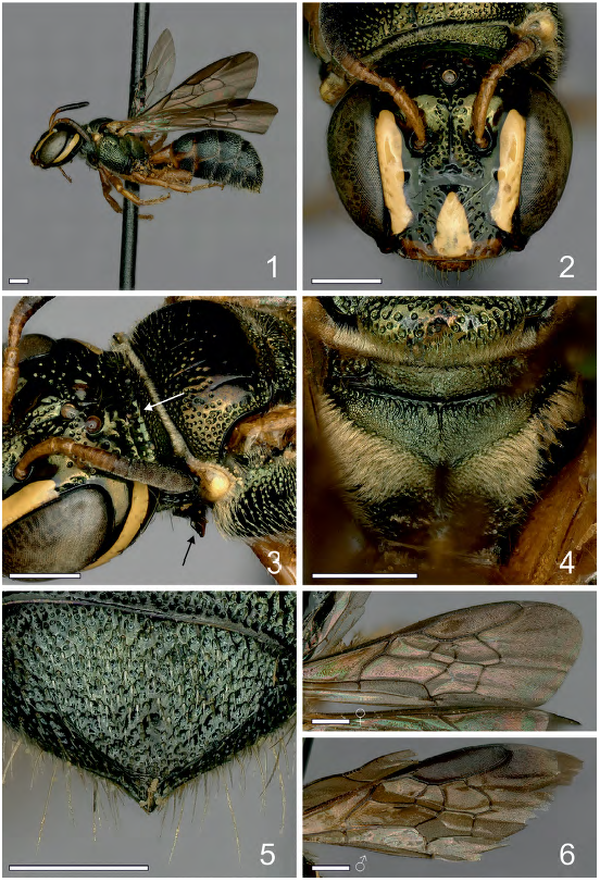 Female. Length 7.7 mm: length of forewing 6.1 mm. Color. Black with dark olive green metallic tints. Scape, pedicel and first flagelomeres reddish brown. Apical tarsomeres brown. Tegula light brown to golden, translucent. Yellow paraocular marks reaching above antennal socket, clypeus with triangular longitudinal yellow mark reaching upper margin. Gena with long longitudinal yellow mark reaching preoccipital ridge. Pronotal lobe with yellow spot. Legs, except coxae, orange. Foretibia with longitudinal yellow band, forefemur with apical yellow spot. Wings brownish, forewing with marginal cell distinctively darker than the rest of wing (Fig. 6). T1 orange.