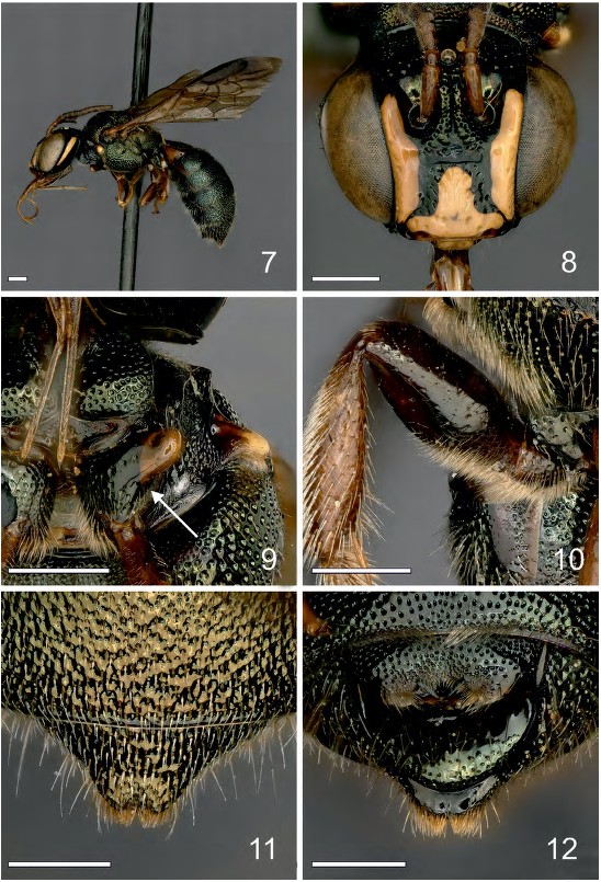 Pubescence. Scarce, dispersed white pubescence, except dense on lateral sides of propodeum (appears golden in lateral view), posterior ridge of scutellum (Fig. 4). Sterna with sparse, but distinct, short apical pubescent bands.