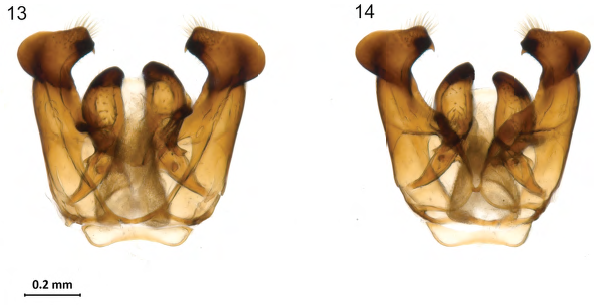 Structure. T6 with median projection with apical short hairs (Figs. 11, 12). T7 with apical margin flanged, with low medial lobe. OD 0.14 mm. Genital capsule, gonostylus with the lateral margin rounded and projected and hairs in the apical margin (Figs. 13, 14).
