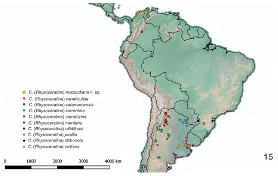 Although Ceratina is a diverse genus in the Neotropics, few species are known from northern South America (Moure, 2012). Only 7 species are recorded from Colombia and Venezuela: 3 of the subgenus C. (Ceratinula), 2 of C. (Crewella) and of C. (Calloceratina), and 2 of C. (Rhysoceratina) including C. macondiana sp. nov. This is the first record of C. (Rhysoceratina) for Venezuela. Moreover, C. macondiana sp. nov. extends the distribution of the subgenus to the extreme north of South America. Based on the current records for the species of this subgenus, C. macondiana sp. nov. and C. nitidifrons have a disjunct distribution from the rest of C. (Rhysoceratina) species (Fig. 15).