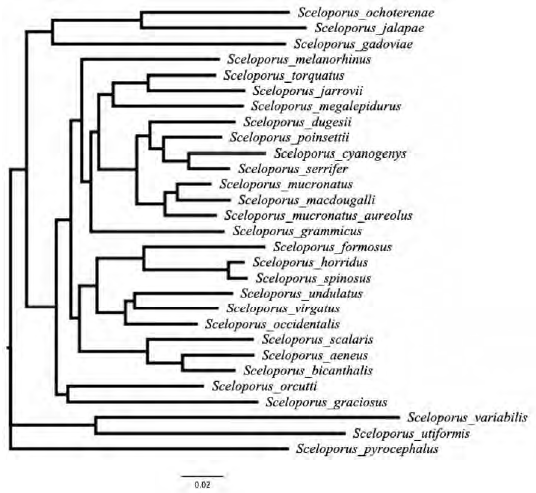 Since we did not gather data for all the species included in the consulted phylogenies (Wiens & Reeder, 1997; Wiens et al., 2010), we decided to generate our own phylogeny that matched our database. We downloaded the sequences used by Leaché (2010) from GenBank (Geer et al., 2010) for the nuclear markers: RAG-1, BDNF, RNA finger print protein 35, and the PNIN gene. We also used the available mtDNA sequences for 12S, NAD1, and NAD4. Sequence alignment was performed using Clustal W (Larkin et al., 2007). The nucleotide data base was run in Modeltest 3.06 (Posada, 2008; Posada & Crandall, 1998) to determine the evolution model used in the phylogenetic inference, then based on Leaché (2010) topology we constructed a template to perform a constrained phylogenetic analysis to conserve Leaché (2010) main topology but setting free the branch calculation for the new topology. We performed a maximum likelihood phylogenetic analysis using RAxLM (Stamatakis, 2014) in a graphical interface called raxmlGUI (Silvestro & Michalak, 2011). Uta stansburiana was used as out-group. We performed 1,000 random bootstrap re-samples to calculate branch support. The phylogenetic tree was visualized and edited in Figtree 1.4.2 (http://tree.bio.ed.ac.uk/software/figtree/).