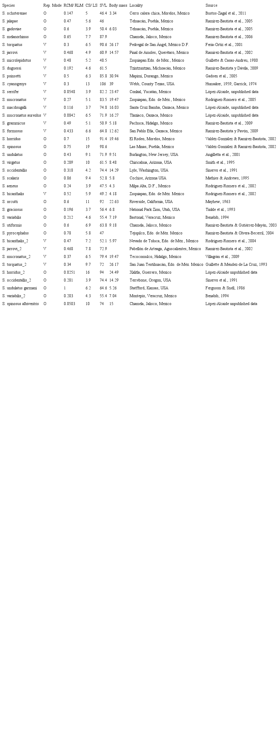 Data set was composed by 38 operative taxonomic units (OTU’s), including 28 species, approximately 31% of all the species contained in the lineage (Table 1). Some species were over represented by more than 1 population, we included all observations to achieve a larger sample. We gathered information from 21 oviparous and 17 viviparous species. Our sampling allowed to include at least 1 species of each of the major and minor clades of the lineage. The data set comprised a 27° range in latitude from Sceloporus occidentalis from Oregon (44.32° N), to Sceloporus mucronatus from Oaxaca (17.26° N), Mexico. Overall, according to our database and among the Sceloporus lineage, body size (SVL) averages 70 mm (± 16.8, range 106-46), body mass 14.28 g (± 9.04, ranges 3.34-39), clutch size or litter size 7.2 (± 3.6, range 4-19), and relative clutch mass or relative litter mass 0.38 (± 0.21, ranges 86-0.025).