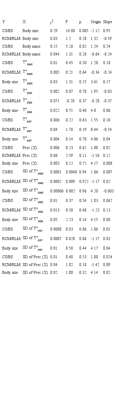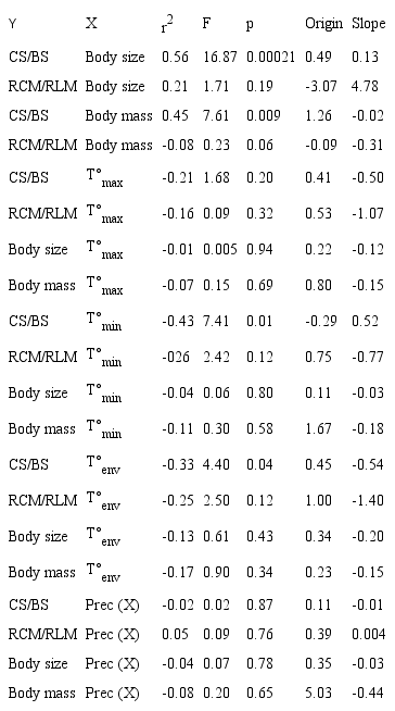 Felsenstein independent contrast analysis between climatic variables and life-history traits showed a significant inverse correlation between minimum environmental temperature (T°min) and average environmental temperature (T°env ) with CS/LS (r2 = -0.43, F = 7.41, p = 0.01 and r2 = -0.33, F = 4.40, p = 0.04; Table 2). Also, body size and body mass showed direct correlations with CS/SL (r2 = 0.56, F = 16.87, p = 0.00021 and r2 = 0.45, F = 7.61, p = 0.009). No correlations between other life history traits or/with environmental variables were detected (Table 2).