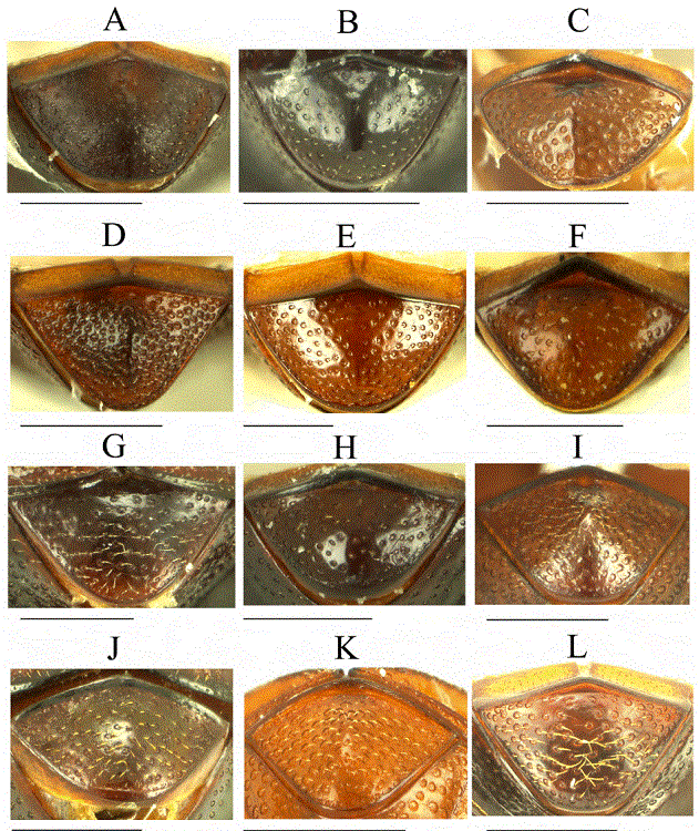 2’. Pigidio con tumescencia media o cresta longitudinal ((Fig. 10C, D, I, K); fovea de la superficie vertical del clípeo presente . . . . . . . . . . . . . . . . . . . . . . . . . . . . . . . . . . . . . . . . . . . . 3