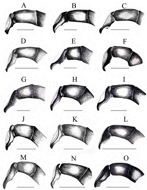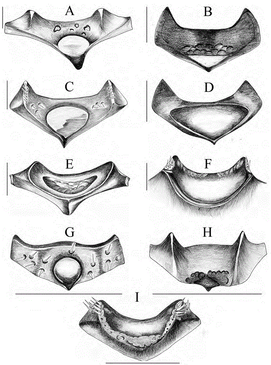 8’. Hipómero sin carena basal (figs. 4B, 5B, 6B, 8E) . . . . . . . . . . . . . . . . . . . . . . . . . . . . . . . . . . . . . . . . . . . . . . . . . . . 10