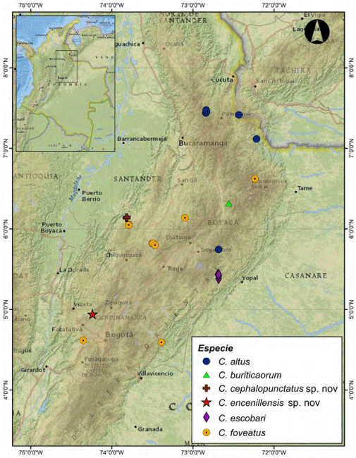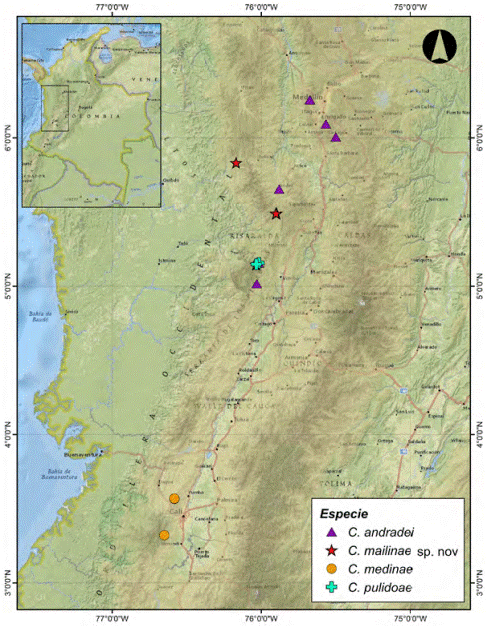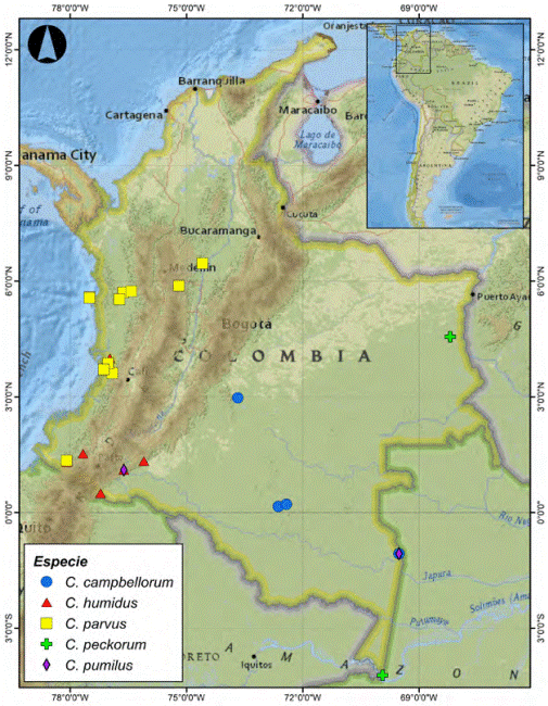 La cordillera de los Andes ha determinado un patrón de distribución altitudinal claramente definido en el género, observándose 3 grupos de especies: el primero está conformado por especies que se caracterizan morfológicamente por presentar las alas posteriores desarrolladas y se distribuyen en tierras bajas por debajo de los 1,540 m de altura (Fig. 16). Las especies C. humidus y C. parvus cubren una franja altitudinal superior a los 1,000 m, mientras que C. campbellorum, C. peckorum y C. pumilus tienen una mayor restricción altitudinal. Sin embargo, C. pumilus está registrada en la serranía de los Churumbelos (Putumayo), ampliando su rango altitudinal hasta los 860 m (tabla 1). El segundo grupo está conformado por especies braquípteras que se distribuyen en la cordillera oriental por encima de los 1,549 m de altura. Se observa una segregación de especies distribuidas hacia las vertientes de la cordillera: C. altus y C. escobari presentes únicamente en la vertiente oriental, C. buriticaorum, C. encenillensis y C. cephalopunctatus en la vertiente occidental y poblaciones de C. foveatus en las 2 vertientes (Fig. 17). El tercer grupo está conformado por especies braquípteras distribuidas en la cordillera occidental por encima de los 1,898 m de altura, el grupo incluye a C. andradei que también se registra en la vertiente occidental de la cordillera central y es la única especie presente en los Andes centrales. Las especies C. medinae y C. pulidoae solo se encuentran registradas en la vertiente oriental y C. mailinae presenta poblaciones en las 2 vertientes (Fig. 18). Las especies braquípteras en los diferentes ramales de la cordillera Andina se encuentran restringidas a estrechas franjas altitudinales que no sobrepasan los 600 m, excepto C. altus con un rango mayor a 700 m (tabla 1).