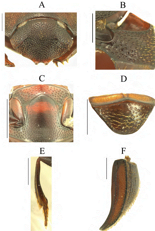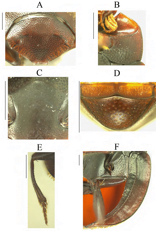 Descripción. Holotipo. Macho. Longitud total: 3.7 mm; ancho humeral: 2.5 mm. Cuerpo color rojizo brillante, con cedas castañas en toda la superficie (Fig. 3D). Cabeza. Clípeo no proyectado anteriormente. Superficie con puntuaciones oceladas, separadas por una distancia menor a su diámetro en la región central y con mayor distancia hacia el borde anterior (Fig. 6A). Margen anterior del clípeo en vista frontal con 2 dientes cortos ampliamente separados y flexionados; disco del clípeo cóncavo; sutura clípeo-genal evidente; margen lateral del clípeo convexa entre los dientes y la gena, dando un aspecto ovalado a la cabeza; diente de la gena levemente proyectado. Superficie vertical del clípeo sin fovea (Fig. 9F). Pronoto. Convexo en la parte media y plano lateralmente; depresiones laterales superficiales en el cuarto posterior. Ángulo anterior del pronoto recto; márgenes laterales curvos en la base. Ángulos posteriores obtusos (Fig. 3E, F). Superficie con puntuaciones densas y profundas, oceladas en los bordes posterolaterales y simples en la región central y el margen anterior. Con sedas pardas, cortas y curvas más densas hacia los bordes laterales. Élitros. Convexos transversal y longitudinalmente; con 7 estrías profundamente marcadas, formadas por 2 líneas con ondulaciones evidentes, disco y la región apical con círculos. Interestrías con una fila de puntuaciones con sedas a cada lado adyacente a la estría; sedas pardas, cortas y rectas. Quilla de la pseudoepipleura fuerte, sin sedas evidentes en el borde. En vista anterolateral, borde externo de la última interestría con una hilera de sedas cortas y curvas. Superficie de la pseudoepipleura con microescultura fuertemente impresa; octava estría completa y fuertemente impresa más evidente en la región anterior, compuesta por 2 líneas que rodean puntuaciones semicirculares grandes, distanciadas por una distancia menor a su diámetro; sin fovea basal (Fig. 6F). Alas. Alas metatorácicas completamente reducidas. Hipómero con microescultura punticulada evidente, sin carena posterior, puntuaciones oceladas profundas y ovaladas más densas en el margen de las coxas y separadas entre sí una vez su diámetro hacia el borde lateral (Fig. 6B). Prosterno. Superficie con puntuaciones oceladas en el borde lateral junto al hipómero. Mesosterno. Superficie con microescultura evidente, en la parte media con puntuaciones dispersas y hacia los lados con puntuaciones grandes, profundas y separadas entre sí menos de una vez su diámetro. Sutura meso-metaesternal bien angulada. Mesepisterno con la misma superficie que los bordes laterales del mesosterno. Metasterno. Superficie con microescultura foveolada fuertemente impresa; región anterior y media lisa, región posterior y lateral con puntuaciones grandes y densas, separadas menos de una vez su diámetro (Fig. 6C). Metaepisterno con microescultura evidente y con una hilera de punturas similares a los de la zona lateral del metaesterno. Patas. Profémur en vista ventral con puntuaciones profundas, dispersas y finas en la mitad anterior y más densas y oceladas en la mitad posterior cerca de la unión al trocánter. Superficie de la protibia en vista ventral lisa; con una carena central marcada, glabra; con 3 dientes apicales en el borde externo, los 2 primeros más cercanos que el segundo y tercero y con dientes de menor tamaño entre ellos. Muesca preapical en el borde interno presente en machos. Mesofémur y metafémur en vista ventral con puntuaciones finas y dispersas. Mesotibia dilatada hacia el ápice, en vista ventral con 2 hileras laterales de sedas pardas en los márgenes laterales, desde la región media hacia el ápice. Metatibia débilmente curvada; superficie dorsal plana con una hilera de sedas desde la región media hasta el margen interno; margen lateral interno fuertemente crenulado evidente desde la región media hacia el ápice, margen lateral apical externo en vista dorsal agudo (Fig. 6E). Abdomen. Superficie del último esternito con puntuaciones grandes y densas. Pigidio convexo con puntuaciones oceladas grandes, con sedas conspicuas; margen de la base con una estrecha depresión media (Fig. 6D). Órgano genital (Figs. 11I, 12I, 13I, 14I, 15I). Parameros subrectangulares con falobase subcuadrangular (Fig. 12I). En vista caudal, estrechos en la parte media y ensanchados hacia el ápice, ápice truncado (Fig. 11I). Saco interno con 3 escleritos apicales, esclerito con un anillo débilmente esclerotizado; con un mango agudo hacia la parte apical, curvo y recto en la parte media, terminando hacia la zona basal con una proyección que se ensancha hacia el ápice (Fig. 13I). Esclerito placa con un extremo en forma de gancho con ápice romo, en el extremo opuesto el ápice con forma triangular, región media escasamente esclerotizada (Fig. 15I). Esclerito elongado con proyecciones setiformes y base poco ensanchada (Fig. 14I).