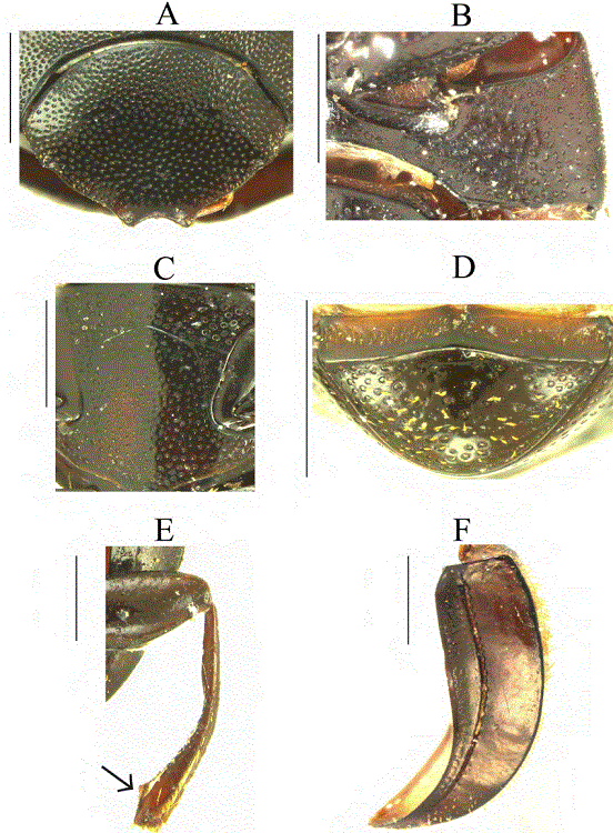 Variación: hembra. Longitud total: 3.73 mm; ancho humeral: 2.58 mm. Características similares al macho, a excepción del borde interno de la metatibia menos curvo que en el macho y sin diente preapical. Dientes clipeales y de la protibia más pronunciados. Protibia sin muesca preapical (Fig. 3D).