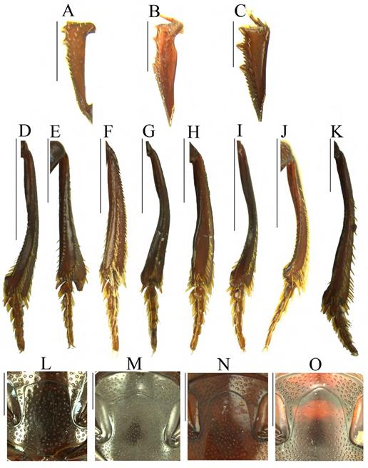 6’. Puntuaciones de cabeza y pronoto menos densa y superficial (Figs. 5A, 6A); sutura meso-metaesternal angulada (Figs. 5C,6C,7L,M).........................................7 Superficie vertical del clípeo sin fovea (Fig. 9F, H, I) . . . . . . . . . . . . . . . . . . . . . . . . . . 8